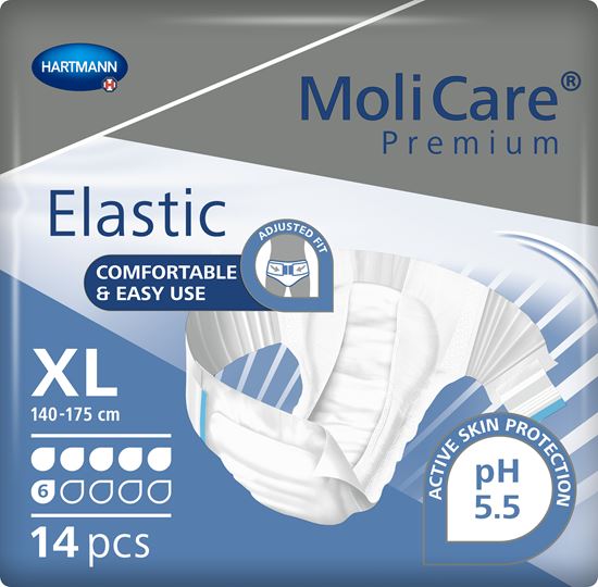 The ElastiFIX Sysem, a unique combination of patented, elasticated side panels and re-closable tapes, allows for easy handling and secure fixation. For maximum safety and security, MoliCare Premium Elastic offers optimum fit in every position and excellent absorbency capabilities.
