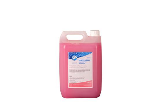 Pink lotion soap for professional washrooms and care homes. Supplied in a large 5L container this liquid offers a hygenic alternative to conventional soap.