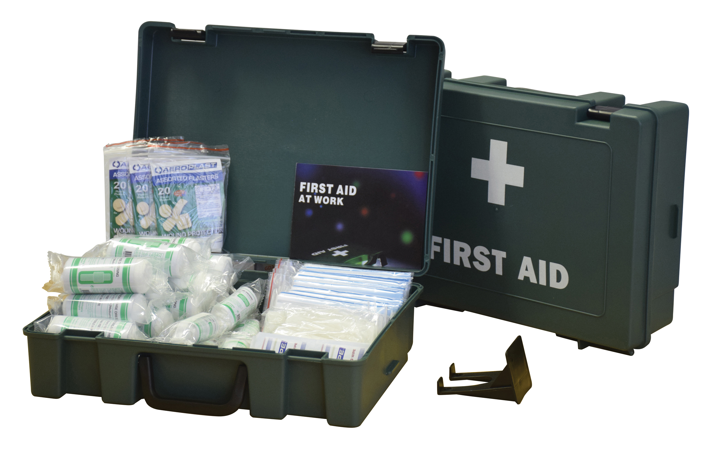 20 person kit contains: 60 plasters, 8 HSE dressings 12x12cm,4 HSE dressings 18x18cm, 6 No 16 eyepads, 8 triangular bandages, 20 antiseptic wipes, 4 pairs of gloves, 12 safety pins, wall hanging bracket, leaflet.