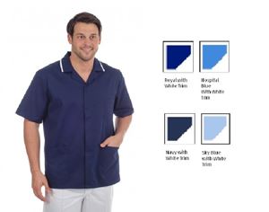 Zip fasten polyester/cotton tunic with two lower pockets and one breast pocket, back shoulder pleats, contrast trim on lower pocket tops, sleeves and collar